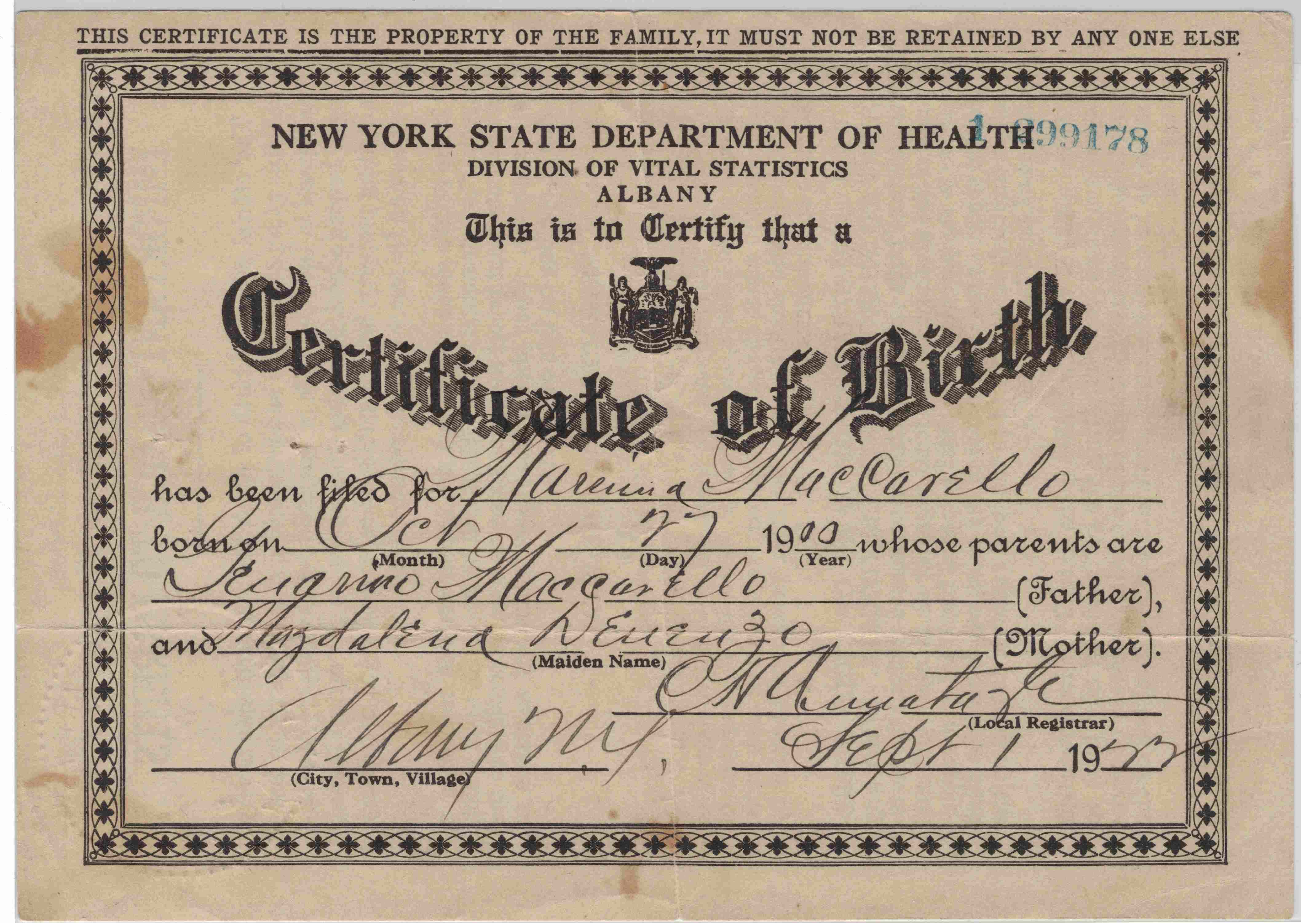 City of Albany, New York, Division of Vital Statistics, certificate of birth (short form), no. 1-299178 (1922), Marianna Maccarello, born 27 October 1900; inherited as part of the estate of [name], 2017; privately held by [name].