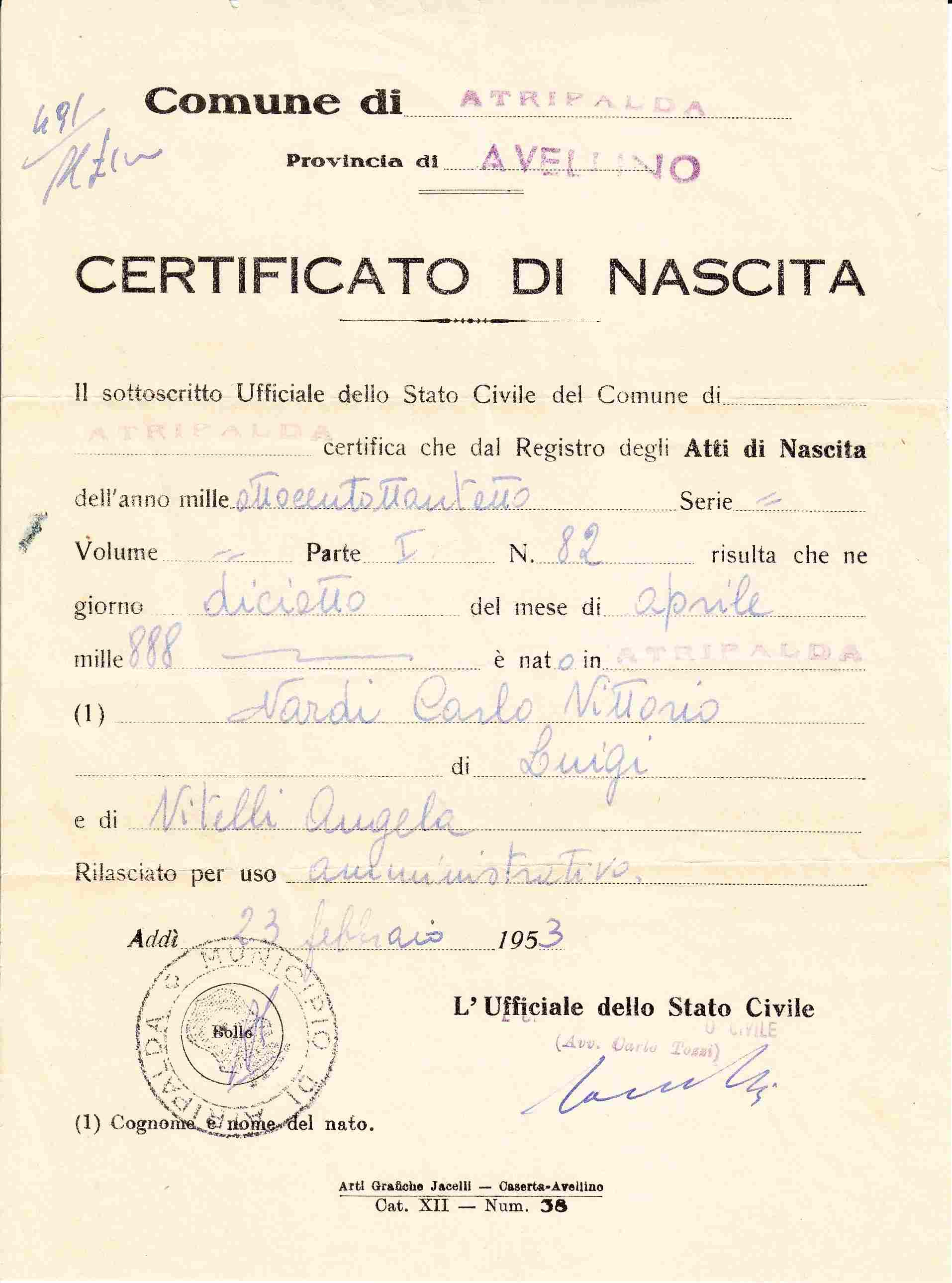 Atripalda, Avellino, Italy, short-form birth certificate marked “Certificato di Nascita,” for Carlo Vittorio Nardi, 18 April 1888, citing “Registro degli Atti di Nascita, 1888, Parte 1,” entry 82, supplied 23 February 1953; inherited as part of the estate of [name], 2017; privately held by [name].