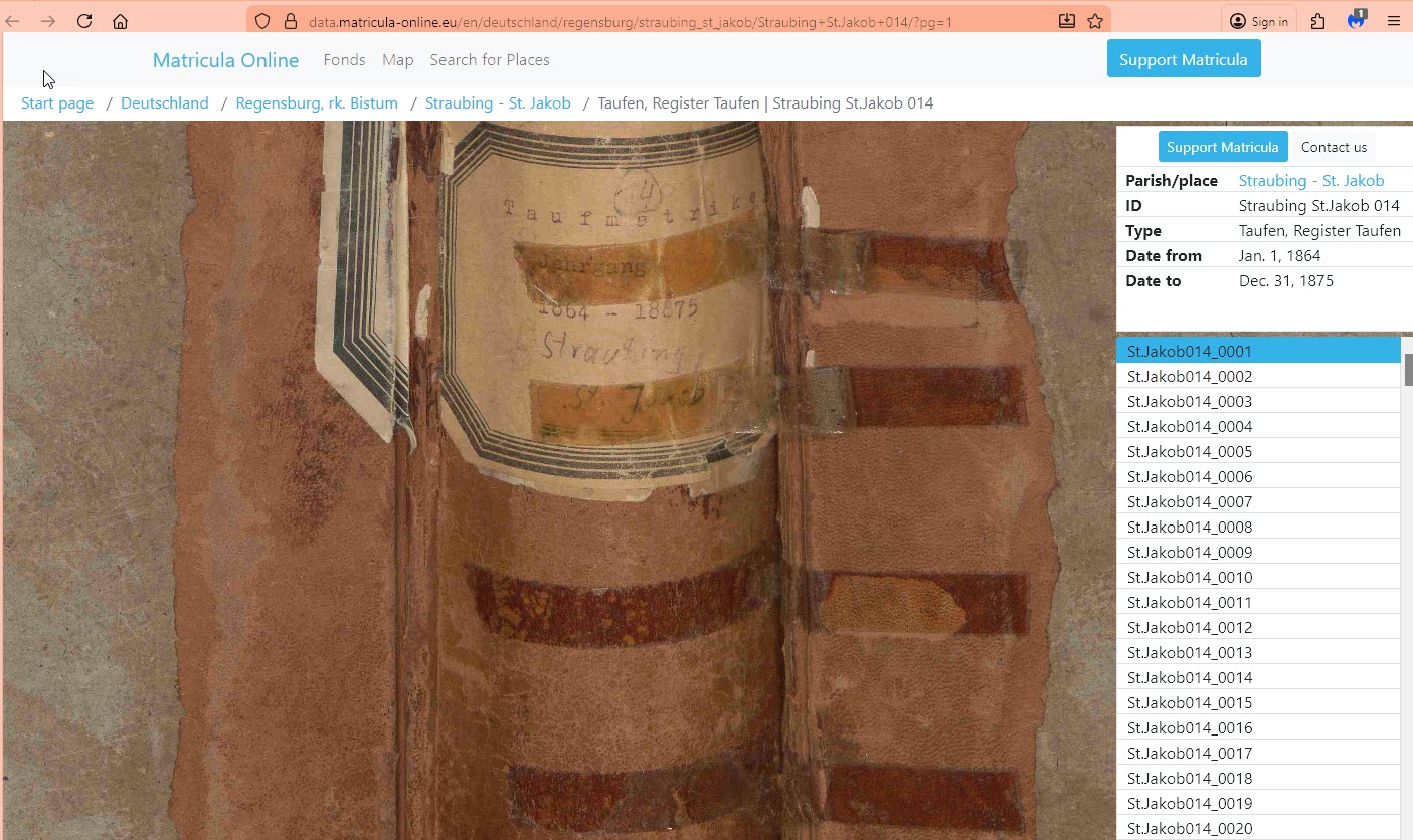 Your Reference Note citations cite "Taufen ... Book 14," but the book that you are citing does not carry that label. As shown in the attached image, it is labeled "Taufmatrike, Jahrgang 1864--18875 [sic] Straubing, St. Jakob." The identification of the book as "14" is the website's identification of the book, within its own organizational scheme.